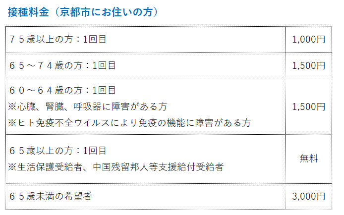 ●接種日現在60~64歳で、ヒト免疫不全ウイルスにより免疫の機能に障害があり日常生活がほとんど不可能な京都市●65歳以上の方で、生活保護、中国残留邦人等支援給付を受給中の方は、無料で接種を受けられます。